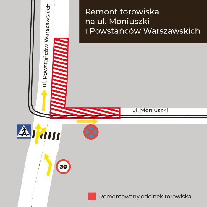 Wprowadzenie tymczasowej organizacji ruchu na ul. Powstańców Warszawskich i ul. Moniuszki spowodowane jest koniecznością remontu przejazdu drogowo-tramwajowego. W związku ze zmianami w organizacji ruchu, kierowcy jadący ulicą Powstańców Warszawskich na wysokości przejścia dla pieszych w rejonie skrzyżowania z ul. Moniuszki będą mogli korzystać tylko z lewego pasa ruchu, z którego będzie możliwość zarówno jazdy na wprost, jak i skrętu w ul. Moniuszki.