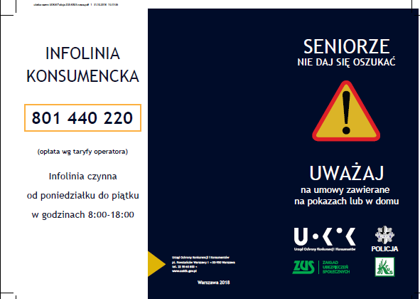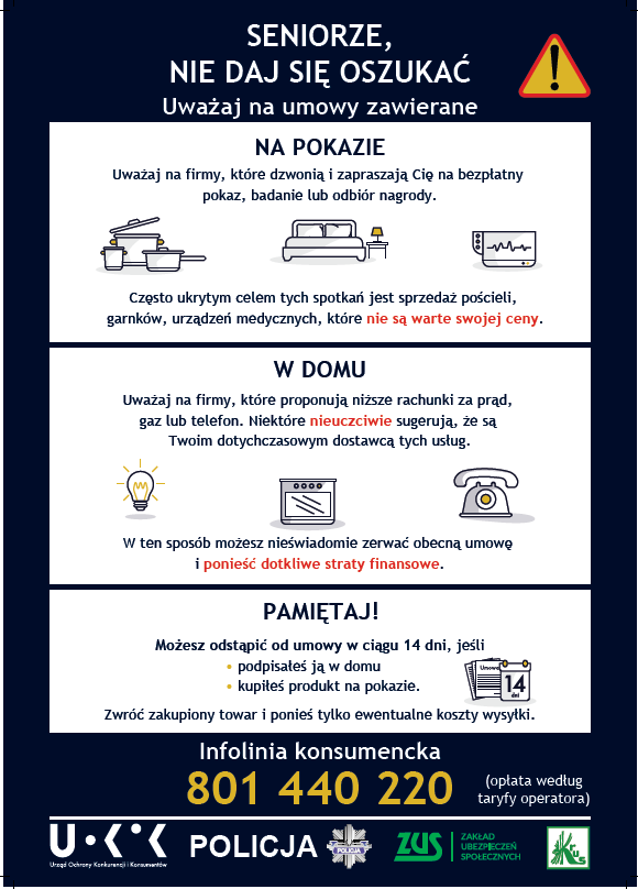 Komendant Główny Policji, gen. insp. Jarosław Szymczyk podpisał porozumienie z prezesami: Urzędu Ochrony Konkurencji i Konsumentów, Zakładu Ubezpieczeń Społecznych i Kasy Rolniczego Ubezpieczenia Społecznego o współpracy w zakresie bezpieczeństwa seniorów. Na jego mocy do dnia 31 stycznia 2019 roku będzie prowadzona kampania profilaktyczna pod hasłem "Seniorze nie daj się oszukać!". Zgodnie z akcją policjanci zajmujący się profilaktyką oraz dzielnicowi będą uczyć seniorów jak nie dać się oszukać przez nieuczciwych przedsiębiorców. Policjanci będą przestrzegać przed tymi przedsiębiorcami, którzy zapraszają na pokazy, podczas których przy okazji bezpłatnych badań i pokazów, kusząc prezentami nakłaniają do zakupu oferowanych przez nich produktów. Najczęściej ukrytym celem takich spotkań jest sprzedaż pościeli, naczyń, urządzeń medycznych, które nie są warte swojej ceny przekraczając o nawet kilkanaście razy wartość rynkową tych produktów. Policjanci będą także przestrzegać przed sprzedawcami wchodzącymi na rynek mediów, najczęściej proponujących niższe rachunki za prąd, gaz lub telefon, którzy nieuczciwie sugerują, że są dotychczasowymi sprzedawcami tych usług, a podstępnie zawierane przez nich umowy mogą powodować dotkliwe straty finansowe.