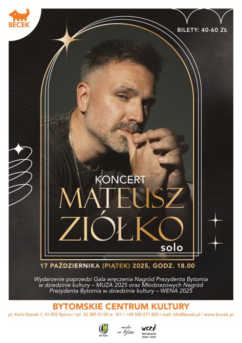 Galę rozdania Nagród Prezydenta Bytomia w dziedzinie kultury – MUZA 2025 oraz Młodzieżowych Nagród Prezydenta Bytomia w dziedzinie kultury – WENA 2025 uświetni koncert Mateusza Ziółko.