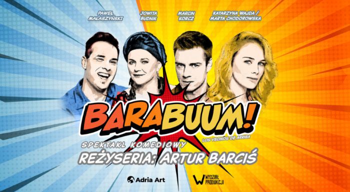 „Barabuum!” to teatralna bomba emocji, która eksploduje w nowoczesnym mieszkaniu Anny i Juliusza oraz ich zuchwałych sąsiadów – Laury i Seby. Wieczór pełen nieoczekiwanych zwrotów akcji zaczyna się niewinnie, ale szybko przeradza się w gorące i prowokacyjne wydarzenie. Z pozornie harmonijnych relacji wyłania się burzliwa mieszanka intryg, zmysłowych podtekstów i nieprzewidzianych konfrontacji.