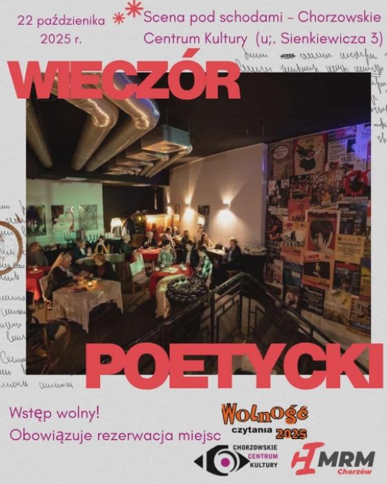Wyjątkowy Wieczór Poetycki pod Schodami, podczas którego usłyszymy twórczość młodych, niezwykle utalentowanych poetek z chorzowskich szkół średnich. Wydarzenie odbywa się w ramach akcji „Wolność Czytania”, organizowanej przez Urząd Miasta Chorzów.