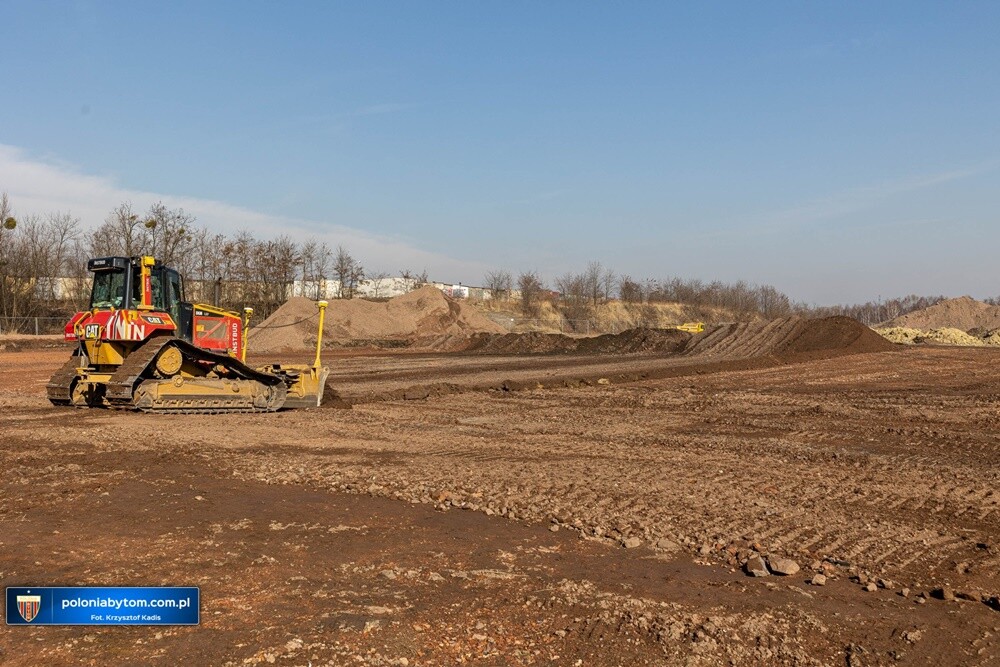 Pierwsze prace przy budowie kompleksu piłkarskiego Polonii Bytom rozpoczęły się 7 lutego tego roku. Wykonawca postawił kontenery zaplecza budowy oraz zamontował monitoring. Wykonano prace geodezyjne, a na początku marca na terenie budowy rozpoczęły się roboty ziemne, w ramach których m.in. usunięto humus (wierzchnią warstwę ziemi). Następnie przystąpiono do korytowania i równania terenu w celu przygotowania poziomu dla wykonania podbudów nośnych dla boiska, trybun, drogi, chodników. W tym celu zostało przeniesionych około 8 tys. mszesc. ziemi z części południowo-zachodniej terenu inwestycji w rejon północny, którego pierwotny poziom ukształtowany jest znacznie niżej i wymaga podniesienia.