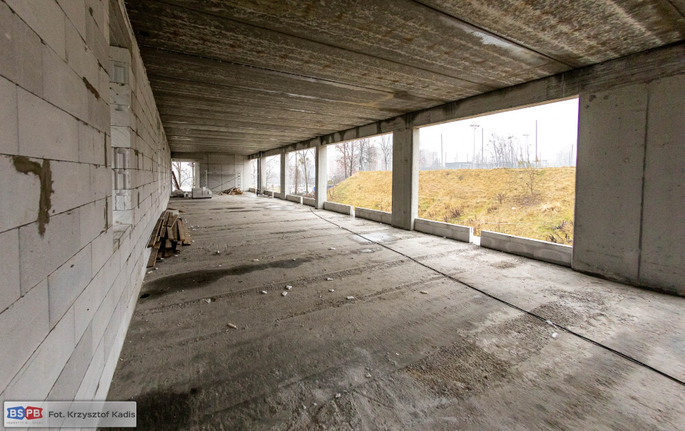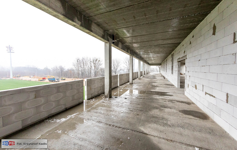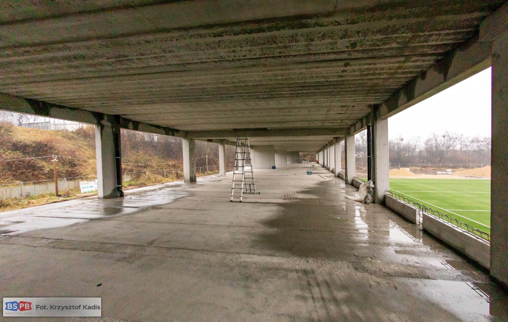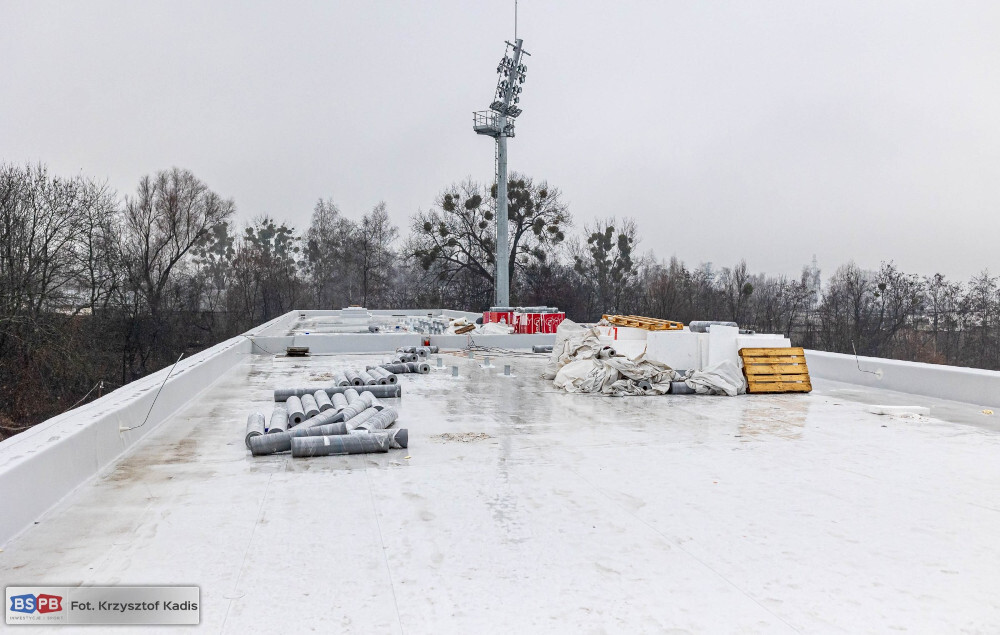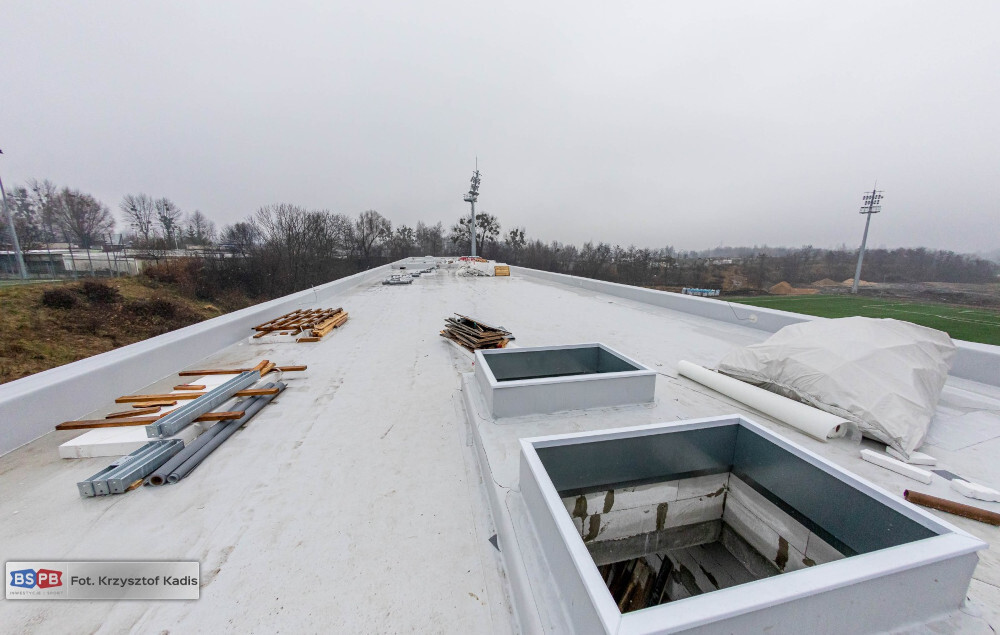 Na płycie boiska zamontowano układ zraszaczy, który czeka na przyłączenie wody i próby sprawdzające. Warto dodać, że na dachu budynku wykonano około 80 proc. warstwy izolacji cieplnej oraz przeciwwodnej a także rozpoczęto montaż instalacji pionów deszczowych odprowadzających wody opadowe z dachu budynku.