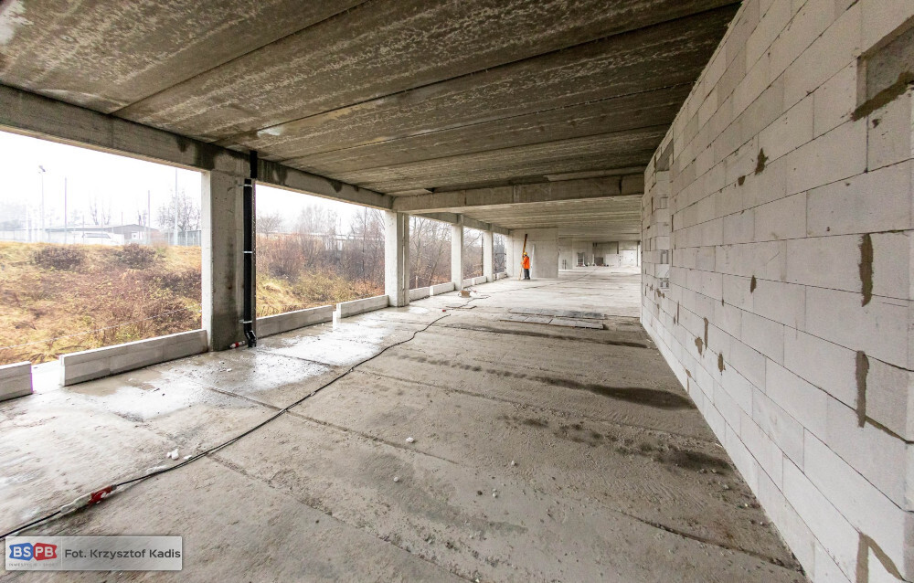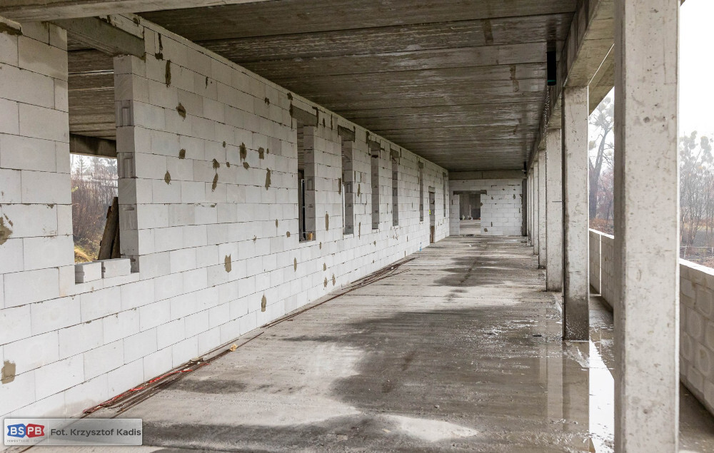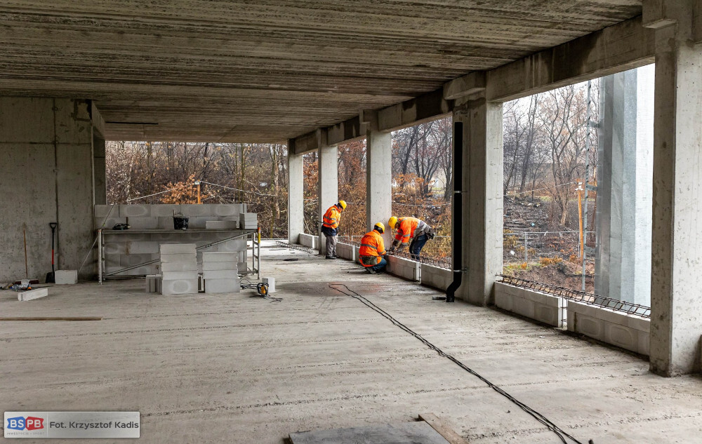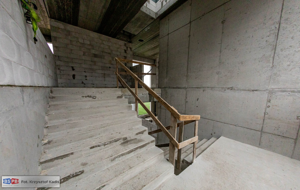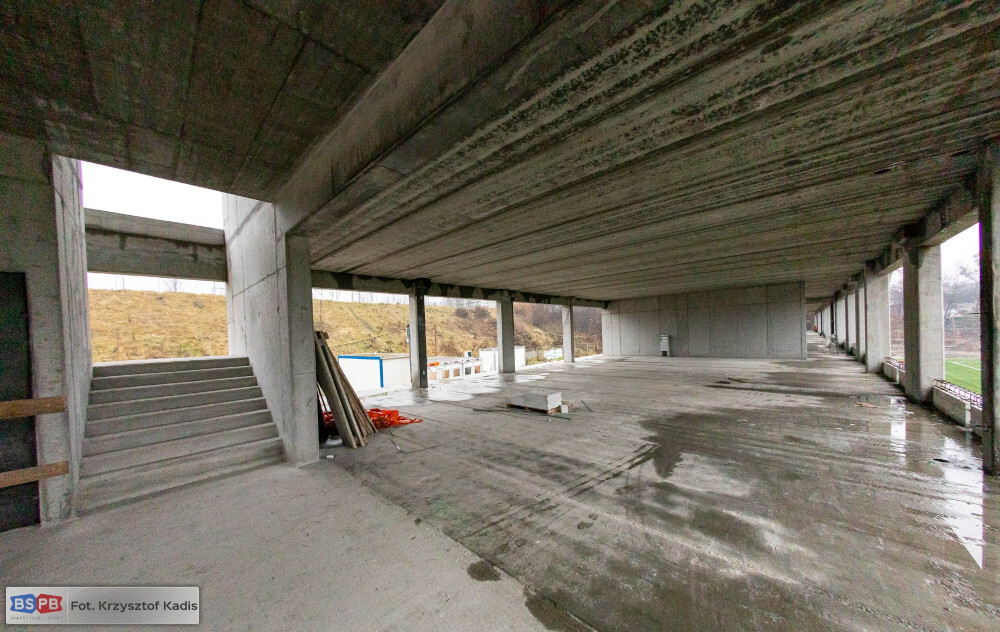 Na płycie boiska zamontowano układ zraszaczy, który czeka na przyłączenie wody i próby sprawdzające. Warto dodać, że na dachu budynku wykonano około 80 proc. warstwy izolacji cieplnej oraz przeciwwodnej a także rozpoczęto montaż instalacji pionów deszczowych odprowadzających wody opadowe z dachu budynku.