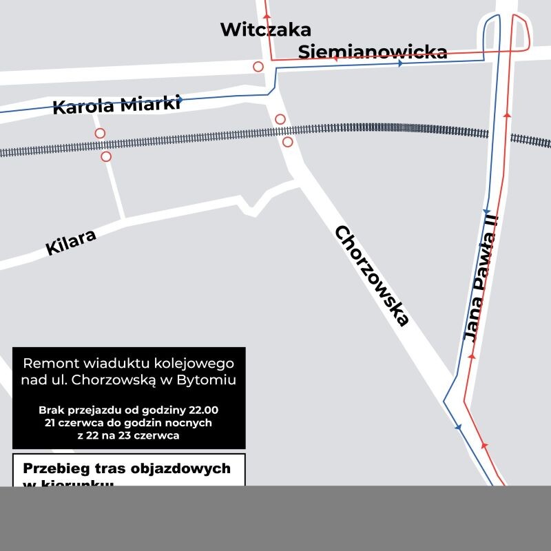 Na czas utrudnień związanych z zamknięciem drogi pod wiaduktem na ul. Chorzowskiej, wykonawca przygotował objazdy. Przejazd z centrum w stronę Chorzowa możliwy będzie ulicami: Siemianowicką i al. Jana Pawła II. Z kolei kierowcy jadący od strony Chorzowa do centrum, będą mogli skorzystać z dwóch możliwości: przejazdu al. Jana Pawła II i ulicą Siemianowicką oraz objazdem ulicami: Chorzowską – Tuwima – Kilara i dalej Łagiewnicką.