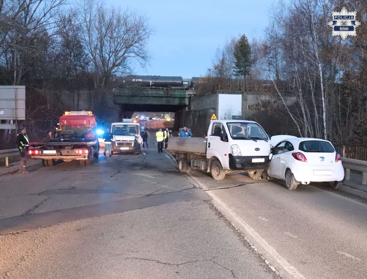 Skierowani na miejsce mundurowi ustalili, że jadący od strony Piekar Śląskich 57-letni mieszkaniec Bytomia kierując fiatem, najechał na tył poprzedzającego pojazdu kia, na skutek czego kierujący kią zjechał na przeciwległy pas ruchu, uderzając w osobowego forda. Na miejsce przybyły odpowiednie służby. Kierujący samochodem osobowym został przewieziony do szpitala.